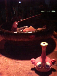 写真は、ペニーレーンのマスターお手製の煮物と、なぜか目の前にあった『ハクション大魔王』の壷。